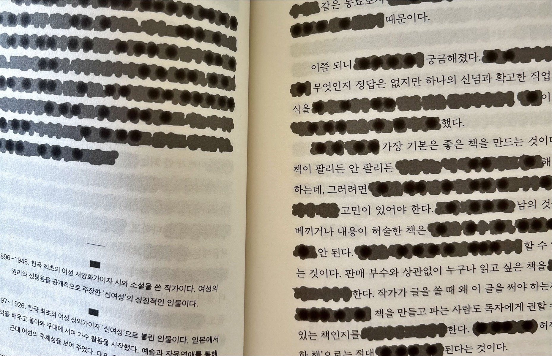 책 만드는 과정을 더 상세히 알게 되었다. ‘기획 - 원고 집필 - 편집 - 디자인 - 인쇄 - 출간 - 유통 - 홍보·마케팅’. 멀리서 보면 유유히 흐르는 출판 과정을 줌인하면 북디자이너가 ‘판면의 하단 여백을 25mm로 할 것인 지 22.6mm로 할 것인지, 첫 행 들여쓰기는 3.35mm가 좋을지 3.3mm가 좋을지, 본문 시작을 9행부터 할 것인지 10행이 좋을지 심사숙고하고 있다. 눈이 둔한 독자는 보여도 보지 못 하는 요소이다. 독자를 유혹하는 표지 디자인이나 작가의 의도를 헤아리기 좋은 글자체, 행간을 읽어 내기에 적절한 행간을 정하는 일은 앞에서 한 ‘헛된’ 숙고에 비하면 독자와 대면하는 수준의 일이다.